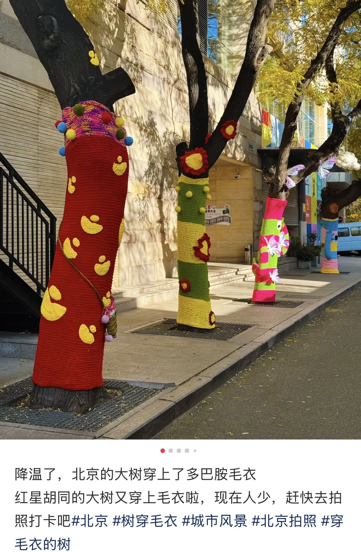 在北京东城区红星胡同里的几棵大树,悄悄换上了“新款毛衣”,树干上分别有毛线织成的手臂、向日葵、爱心等图案。这些多彩的“毛衣树”成为胡同里最暖的风景.