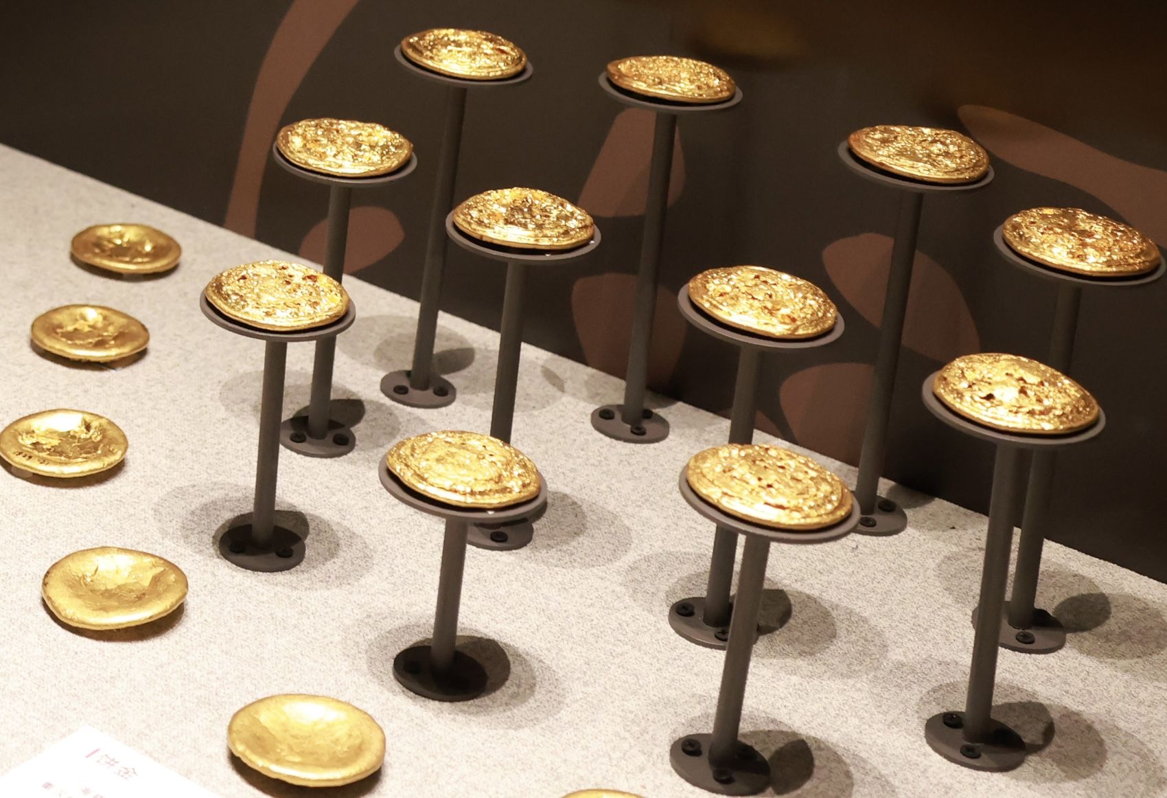马蹄金,亦称褭蹏(音同鸟蹄)金,其形制中空,整体状似马蹄。大部分底部铸有或贴有“上”“中”“下”等字样。“通过检测,它们的纯度和重量以及工艺都是差不多的。关于为何有上、中、下等字样,还有待研究人员继续研究。”
