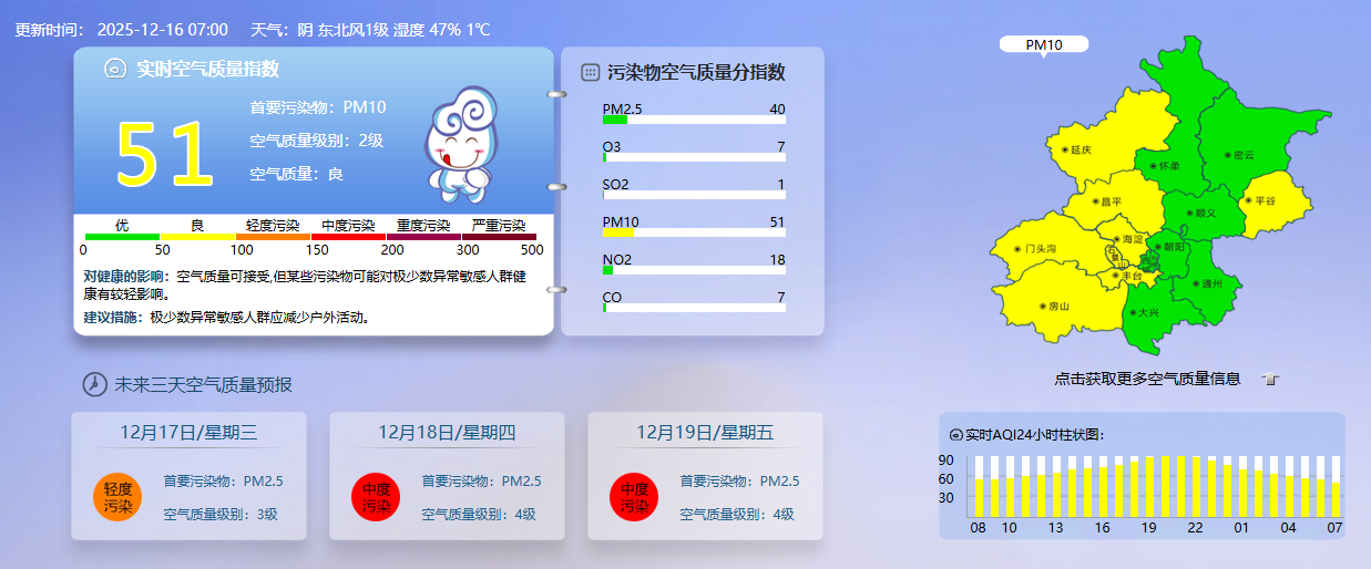 据北京市生态环境监测中心今早7时数据,目前实时空气质量指数51,空气质量良。