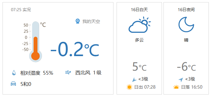 今天白天多云,高海拔山区有零星小雪,北转南风二三级,最高气温5℃;夜间多云转晴,南转北风一二级,最低气温-6℃。