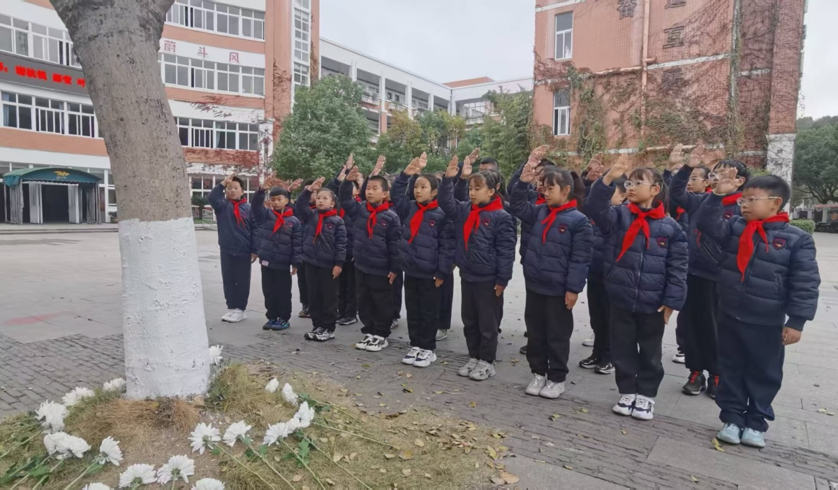2025年12月13日,蔚斗小学学生们在沙朴树下参加南京大屠杀死难者国家公祭日活动。 杨静雅 摄