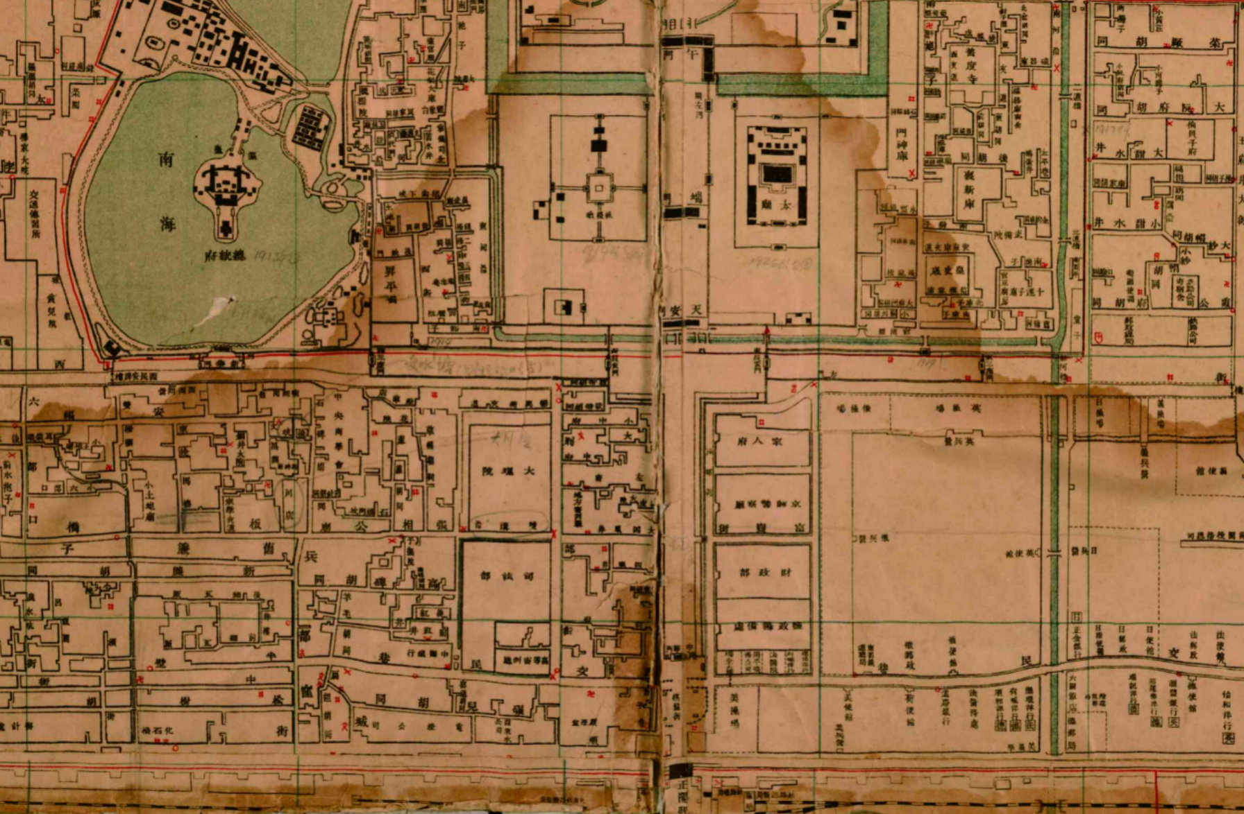 改造前天安门“T”形空间(1914年《实测北京内外城地图》侯仁之存图)。《图说北京古城变迁史》插图