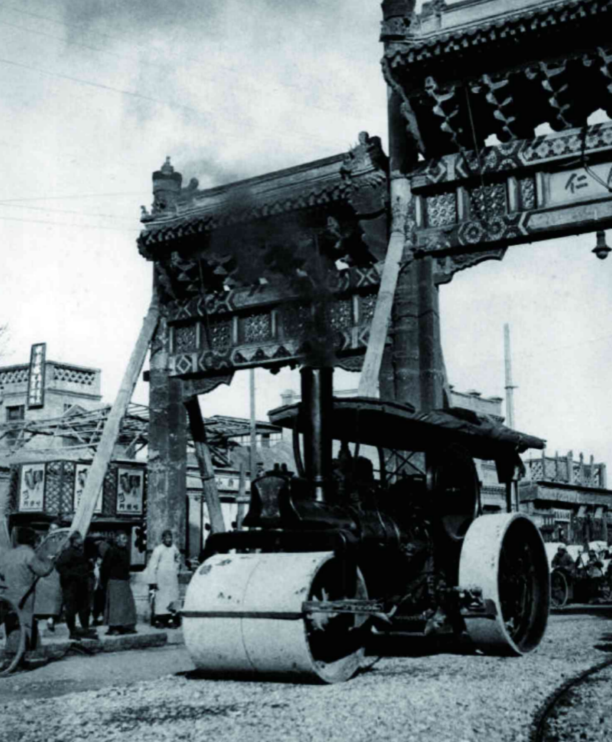 20世纪30年代,北京东四牌楼下一辆轧路机在修整路面(爱伦·凯特林摄)。《图说北京古城变迁史》插图