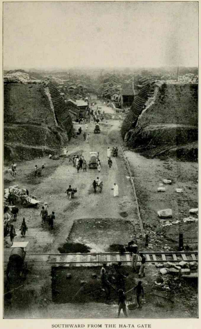 1901年庚子之变后,崇文门附近豁口,铁道横贯瓮城而过(《从阿穆尔到北京紫禁城》)。《图说北京古城变迁史》插图