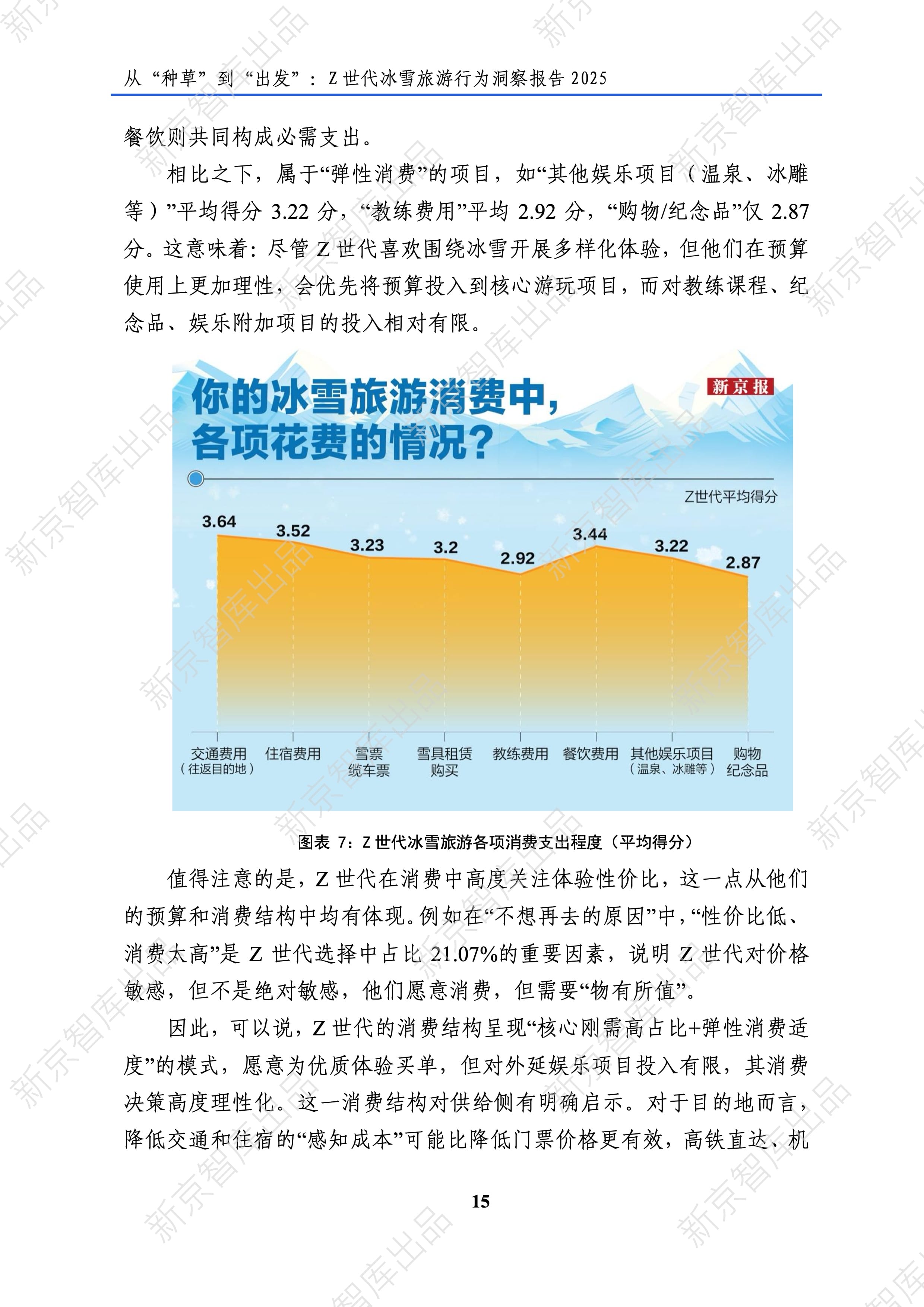 Z世代消费结构呈“刚性支出优先、弹性消费克制”特征:交通住宿是首要支出项,教练服务、装备购买等弹性消费相对克制,体现出精打细算的消费理性。