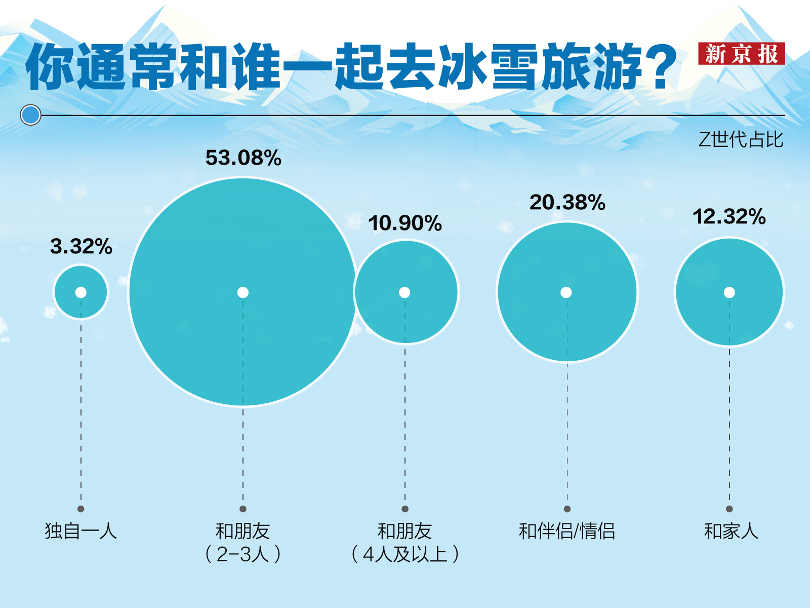 其次是“朋友局”压倒“家庭游”。《报告》显示,近64%的Z世代选择和朋友结伴出行,这一比例是非Z世代的两倍多;相比之下,与家人同行的Z世代仅占12.32%。冰雪旅行在年轻人眼中,不是一次需要协调全家档期的“年度任务”,而更像是一场说走就走的社交事件。重要的是和谁一起去,而不仅仅是去哪儿。这意味着,一座城市要吸引年轻人,不能只讲“适合全家出游”,还得提供能让朋友们一起玩、一起拍、一起发朋友圈的场景。