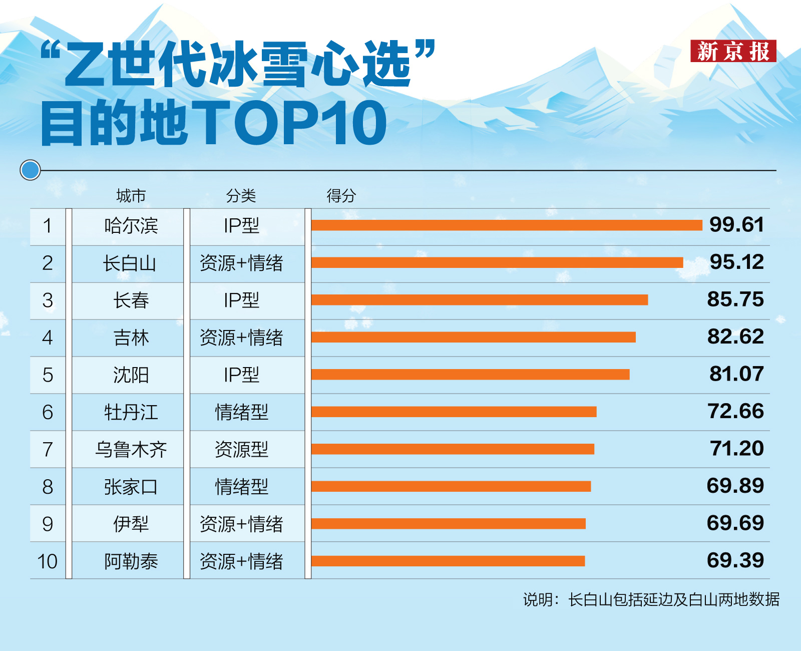 Z世代冰雪心选目的地TOP10。城市类型根据内容平台上的内容标签进行分类。