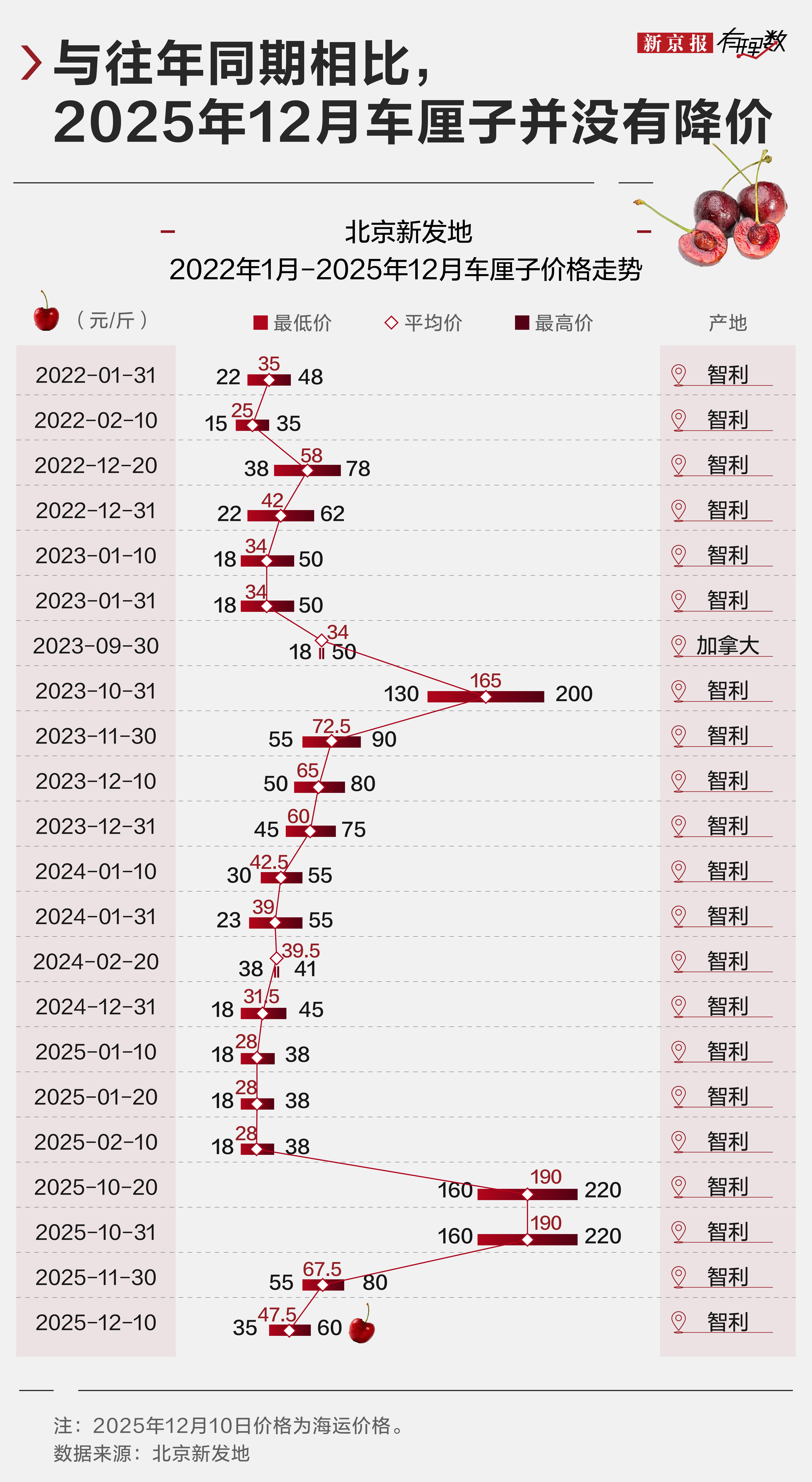 所以综合来看,1-2月才是最适合购入的价格的“谷底”。这是因为12月是海运车厘子首批到货期,供应链还在逐步放量,而1-2月进入供应高峰期,“车厘子快线”密集到港,单月进口量是12月的1.5倍以上,价格自然进一步下探。