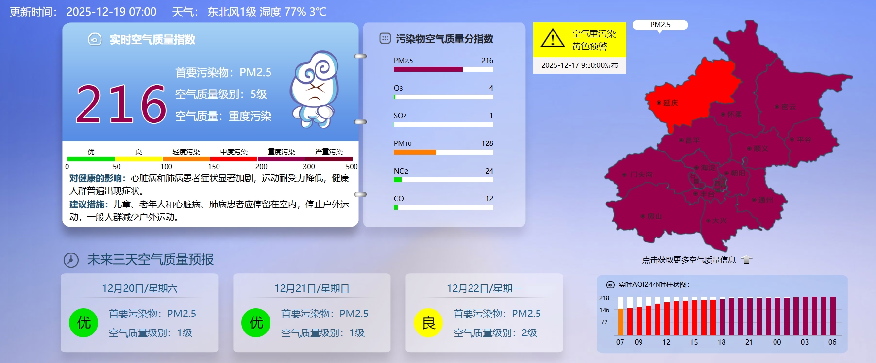 据北京市生态环境监测中心今早7时数据,目前实时空气质量指数216,空气质量重度污染。
