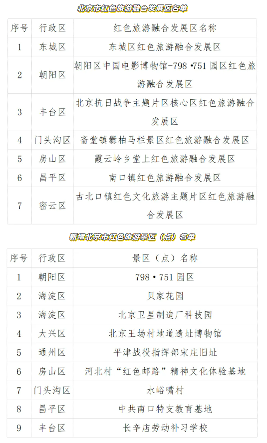 新京报讯 据“文旅北京”微信公众号消息,依照文化和旅游部发布的《红色旅游融合发展区等级划分》及《北京市红色旅游景区(点)评定管理办法》(京文旅发[2022]43号)的相关规定,经各区推荐、现场踏勘、专家会商等环节,最终7个融合区通过北京市红色旅游融合发展区的评定,9家单位通过北京市红色旅游景区(点)的评定。