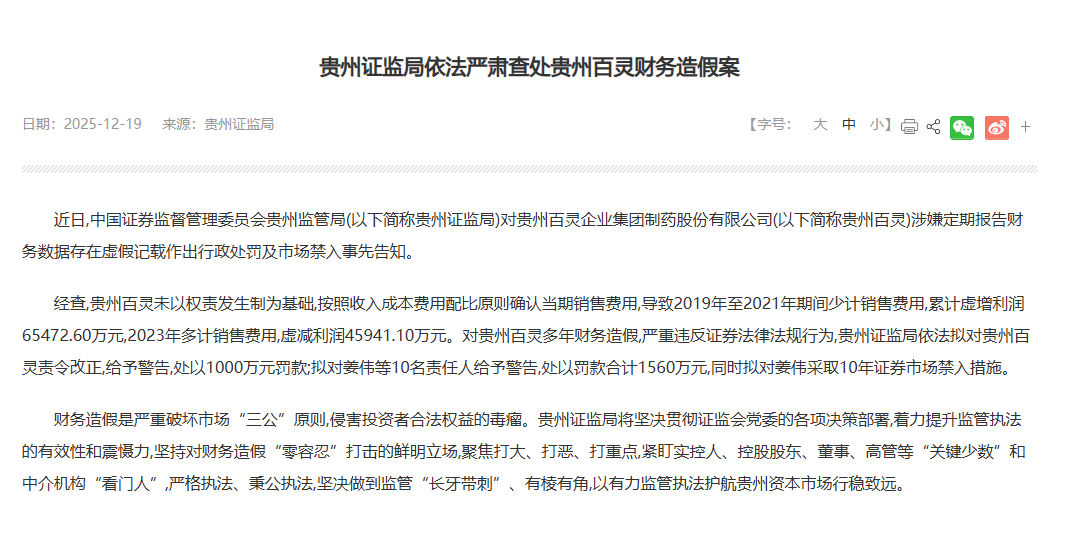 经查,贵州百灵未以权责发生制为基础,按照收入成本费用配比原则确认当期销售费用,导致2019年至2021年期间少计销售费用,累计虚增利润65472.60万元,2023年多计销售费用,虚减利润45941.10万元。对贵州百灵多年财务造假,严重违反证券法律法规行为,贵州证监局依法拟对贵州百灵责令改正,给予警告,处以1000万元罚款;拟对姜伟等10名责任人给予警告,处以罚款合计1560万元,同时拟对姜伟采取10年证券市场禁入措施。