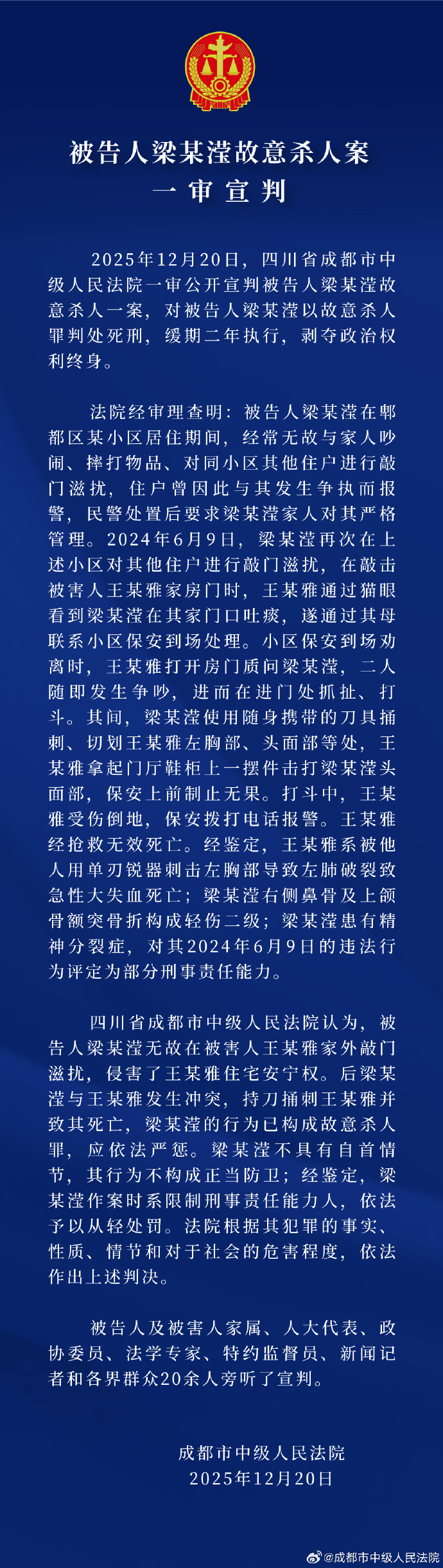 新京报讯 据四川省成都市中级人民法院官方微博消息,2025年12月20日,四川省成都市中级人民法院一审公开宣判被告人梁某滢故意杀人一案,对被告人梁某滢以故意杀人罪判处死刑,缓期二年执行,剥夺政治权利终身。