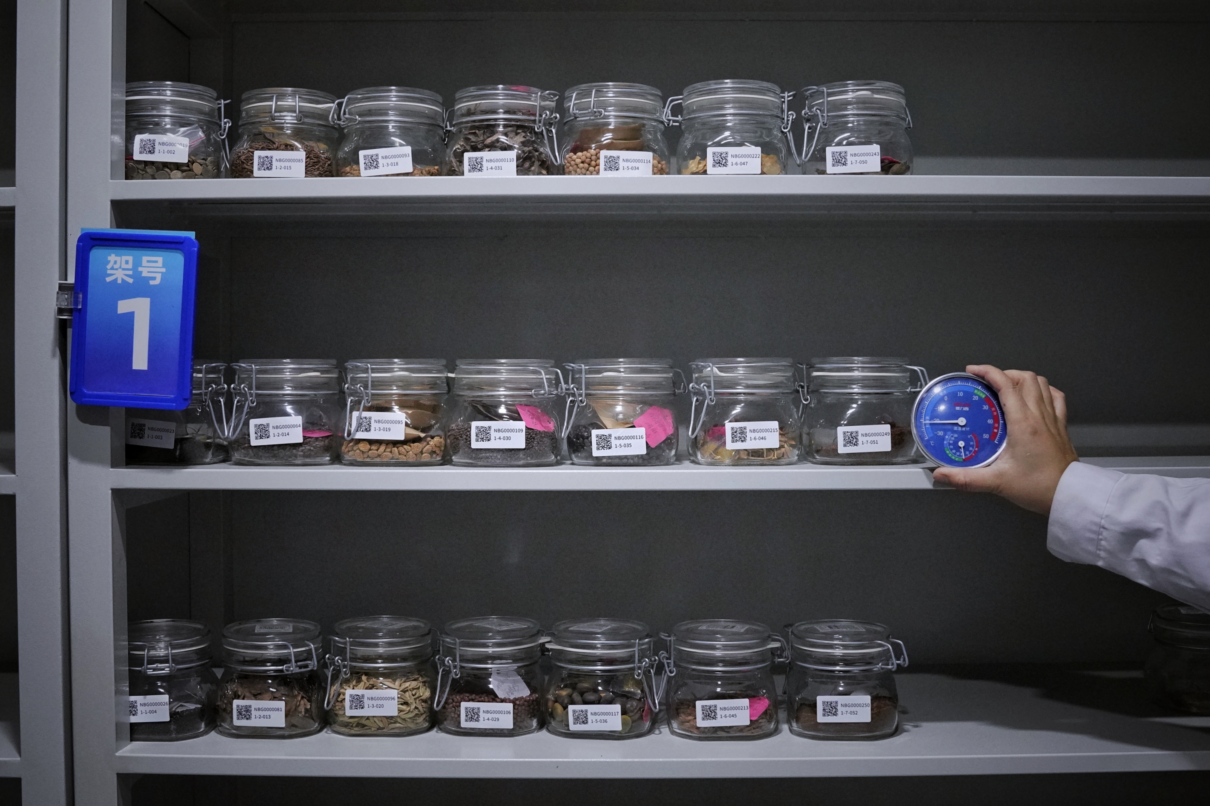 国家植物园(北园)正高级工程师孟昕在干燥间检查种子。新京报记者 薛珺 摄