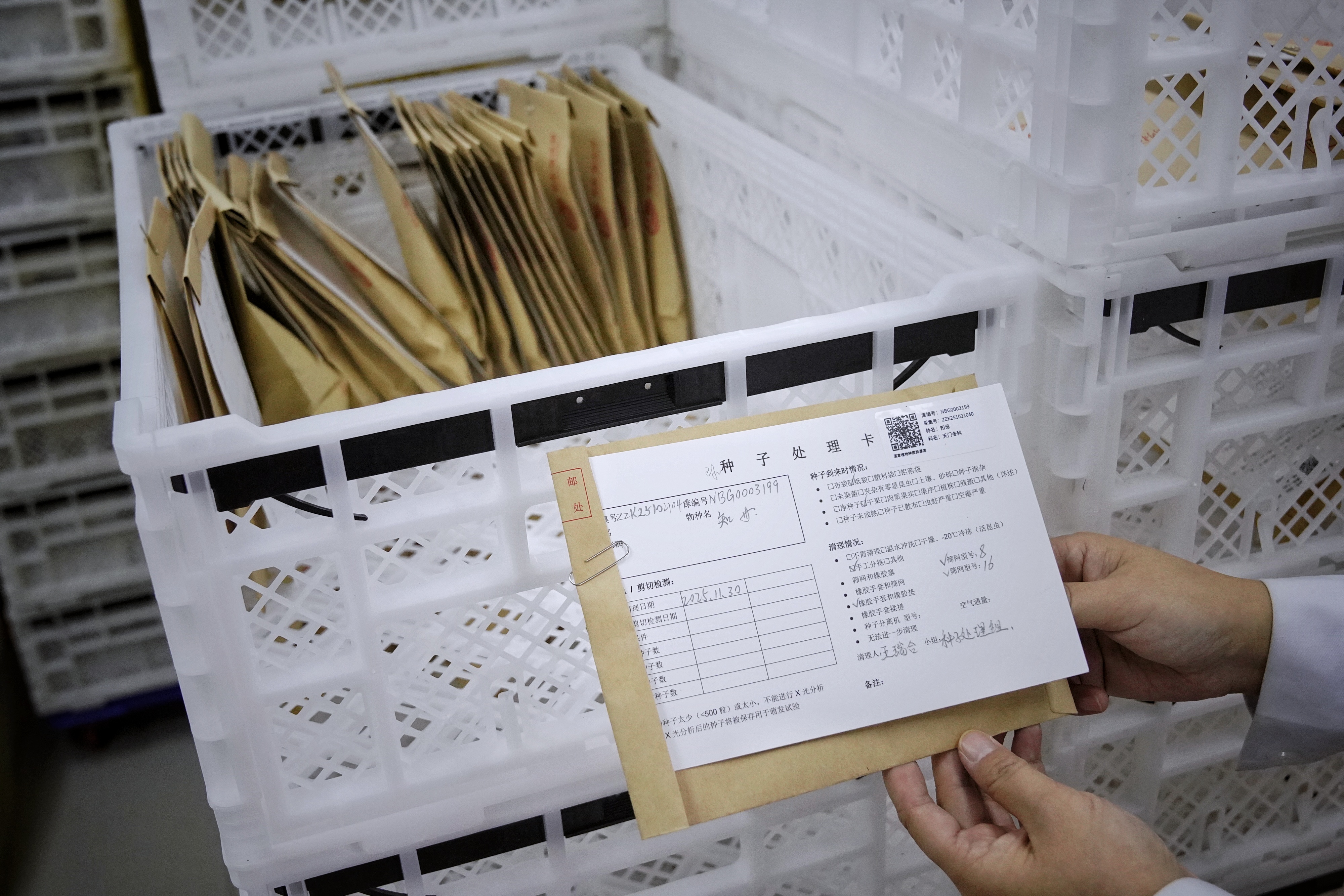这些种子到达预备库第一站“登记室”后,会获得一个新且唯一的身份ID号,这个库编号以NBG开头,它被打印在一张二维码标签纸上,标签上还包含采集号、种名、科名等信息。