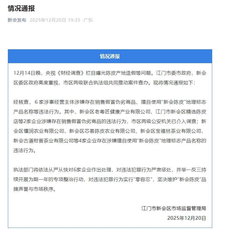 新京报讯 据新会发布消息,12月14日晚,央视《财经调查》栏目曝光陈皮产地造假等问题。江门市委市政府、新会区委区政府高度重视,市区两级联合执法组共同推动案件查办。现将情况通报如下: