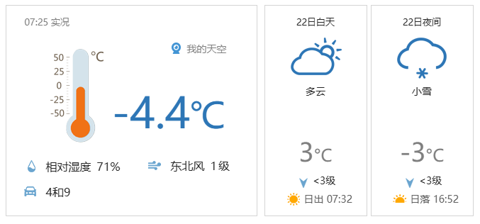 今天白天晴转阴,北转南风二三级,最高气温3℃;夜间阴转小雪或零星小雪,南转北风一二级,最低气温-3℃。