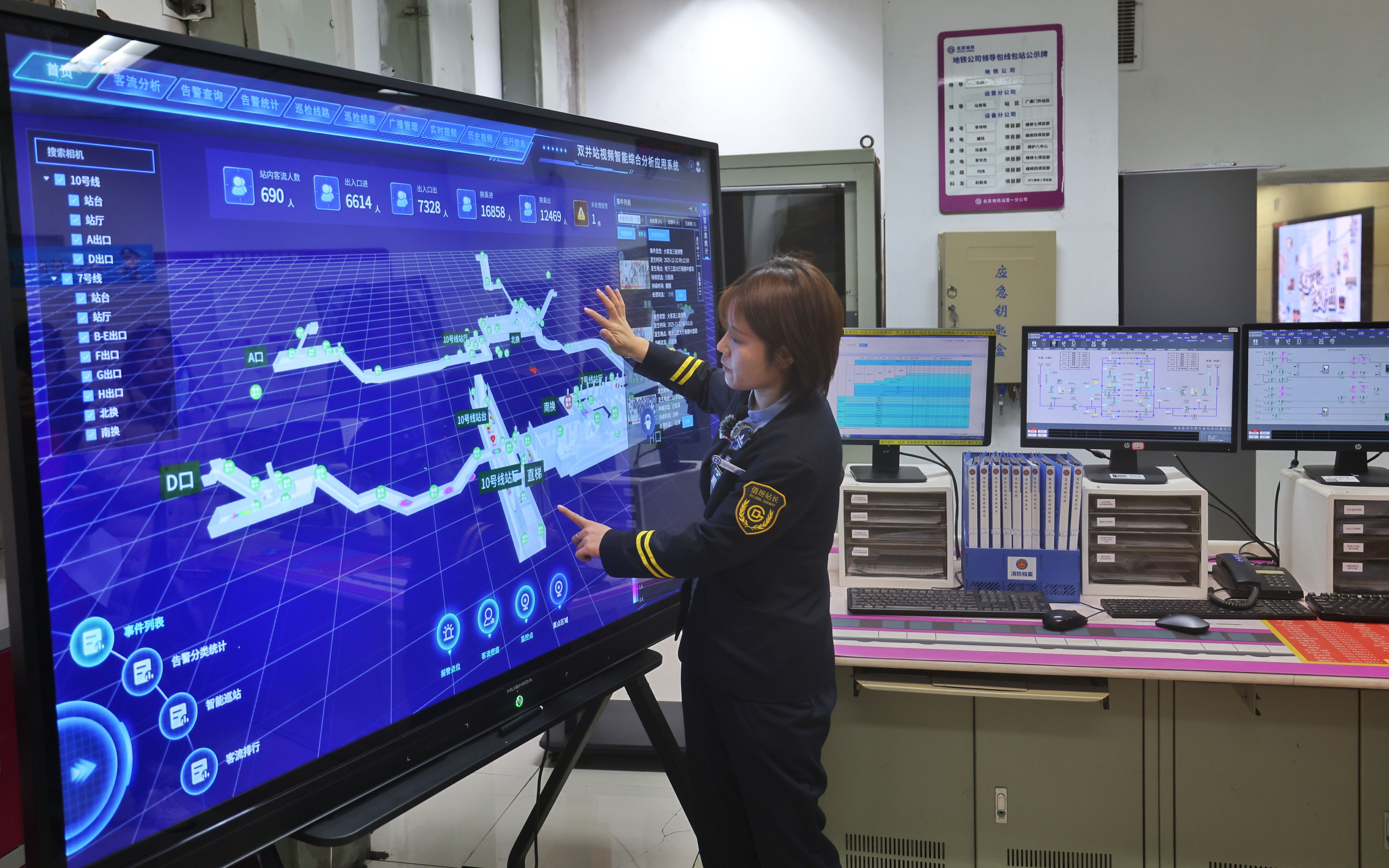 12月22日上午,北京地铁10号线双井站综控室内,工作人员在演示视频智能综合分析应用系统。新京报记者 王贵彬 摄