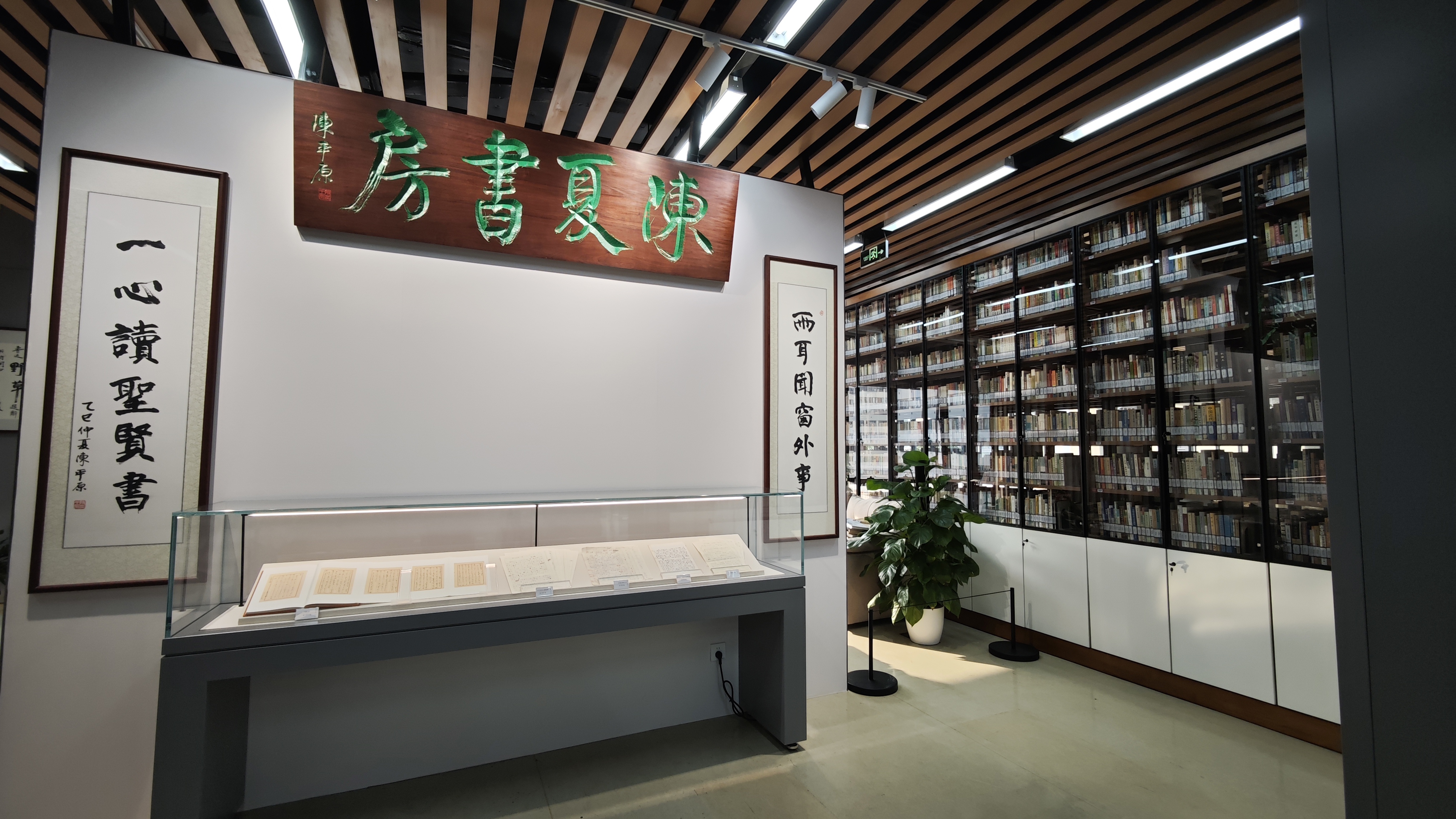 书房里展出了陈平原题写的匾额和对联。首都图书馆供图