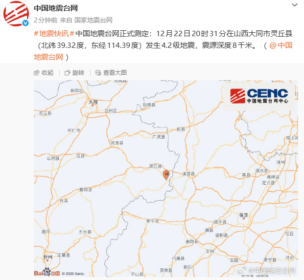 山西大同市灵丘县发生4.2级地震,震源深度8千米,北京有震感