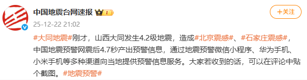 据@中国地震台网速报 消息,北京、石家庄有震感。