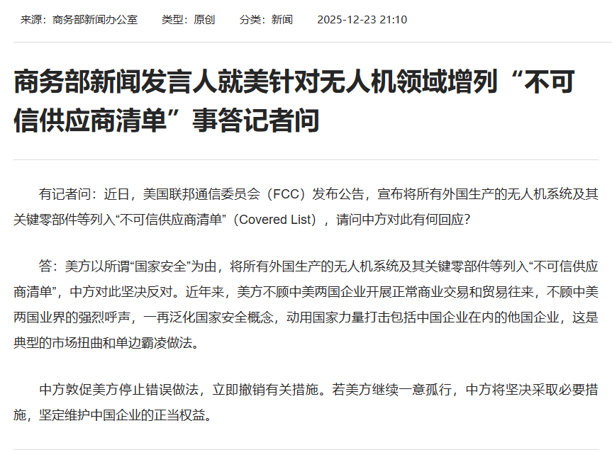 有记者问:近日,美国联邦通信委员会(FCC)发布公告,宣布将所有外国生产的无人机系统及其关键零部件等列入“不可信供应商清单”(Covered List),请问中方对此有何回应?