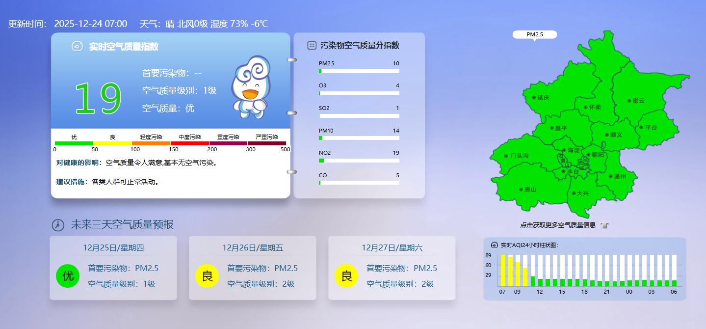 据北京市生态环境监测中心今早7时数据,目前实时空气质量指数19,空气质量优。