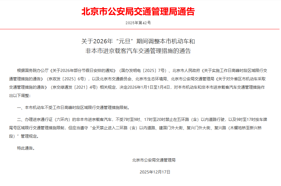 新京报讯 据北京市公安局交通管理局网站消息,根据国务院办公厅《关于2026年部分节假日安排的通知》(国办发明电〔2025〕7号)、北京市人民政府《关于实施工作日高峰时段区域限行交通管理措施的通告》(京政发〔2025〕6号),以及北京市交通委员会、北京市生态环境局、北京市公安局交通管理局《关于对外省区市机动车采取交通管理措施的通告》(京交绿通发〔2021〕4号)相关规定,决定2026年1月1日至1月4日,对本市机动车和非本市进京载客汽车交通管理措施作出以下调整: