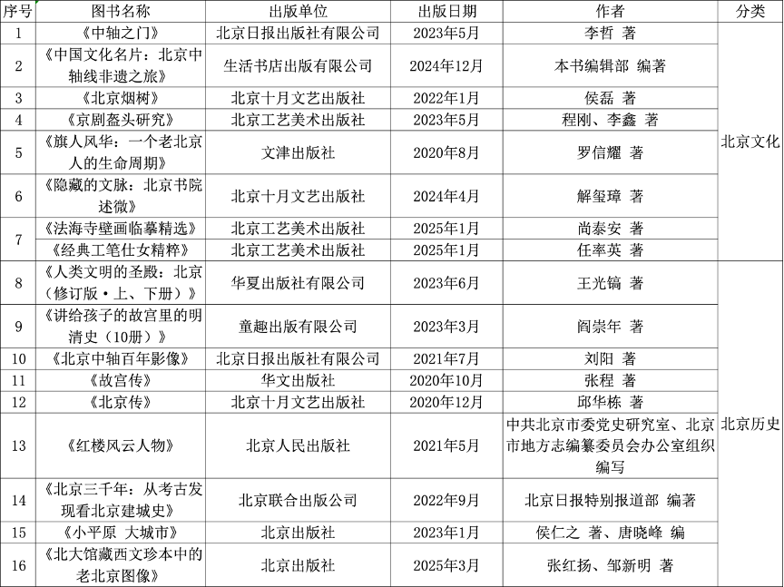 本次发布的推荐书目涵盖范围广泛,体裁多样,深度与可读性兼具。书目中既有《人类文明的圣殿:北京》这样从宏大视角剖析北京历史文化地位的学术著作,也有《北京烟树》《四合院活物记》等充满生活气息、承载城市记忆的散文随笔;既有《北京常见野鸟图鉴》《讲给孩子的故宫里的明清史》《北京城的脊梁:中轴线的故事》等面向青少年的科普读物,也有《上阳台》《如果大雪封门》等深刻描绘北京历史与当代生活的文学作品。这些图书从不同维度梳理北京文脉、讲述北京故事、展现北京风貌,共同构成了一道亮丽的“京彩书香”风景线。