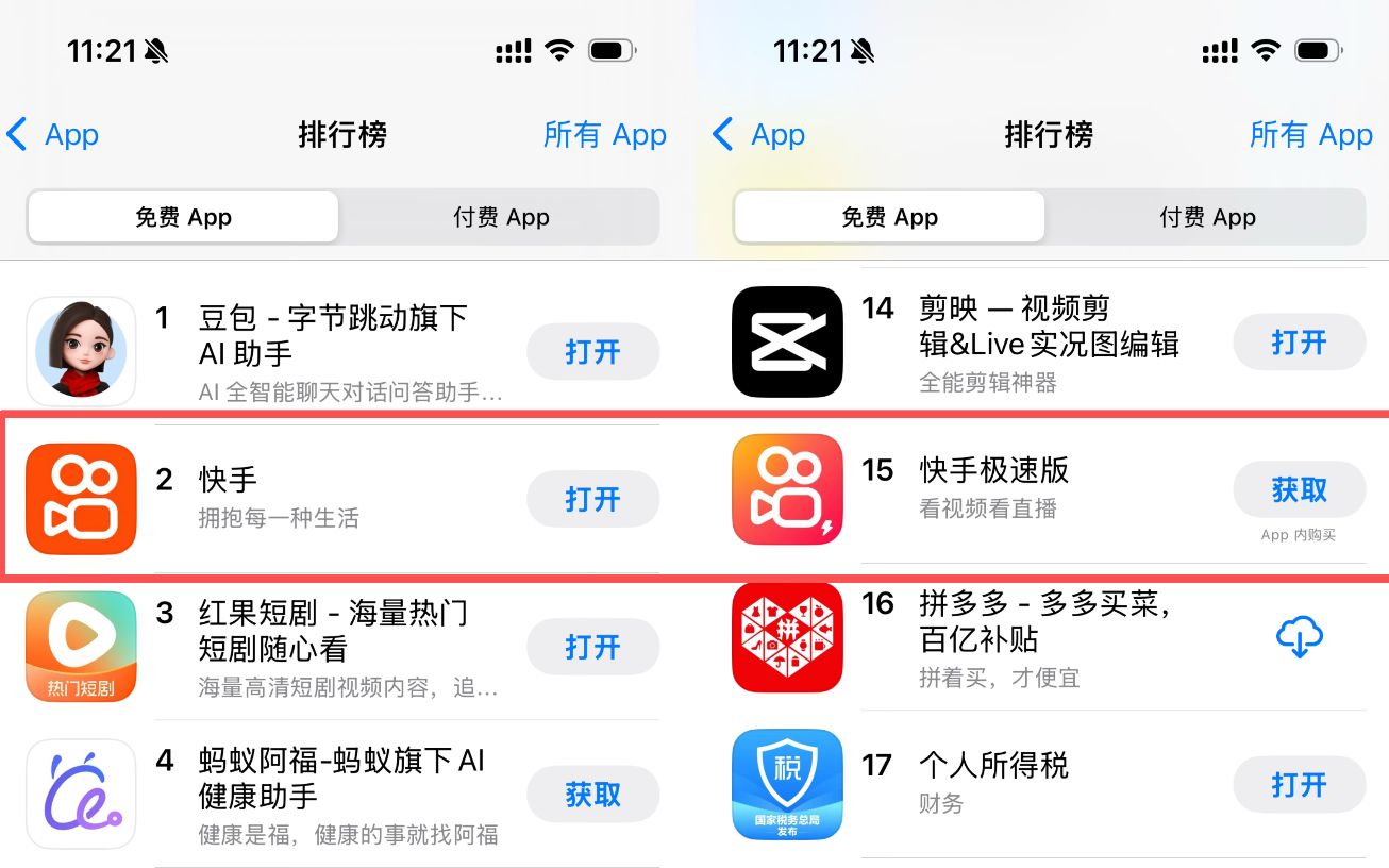 截至23日午间,记者查询苹果商店页面发现,快手居免费App排行榜第二名,快手极速版居第15名。