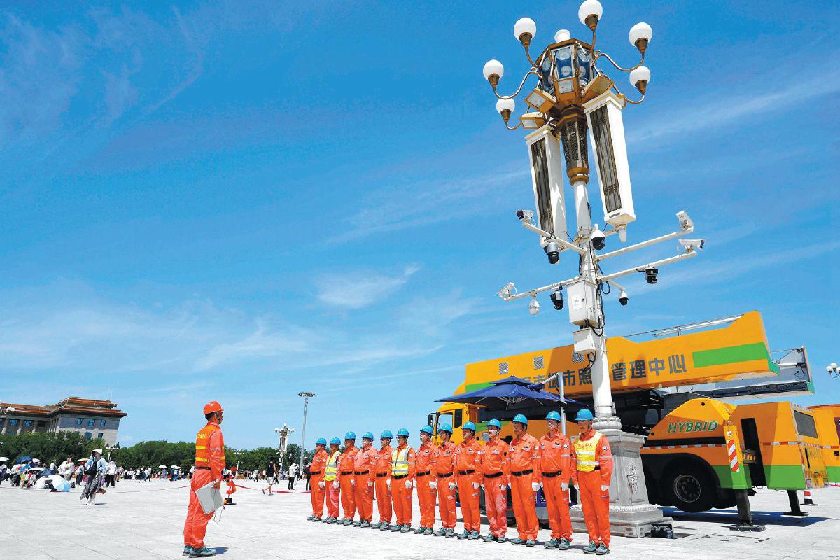 2025年7月7日,国网北京电力城市照明中心华灯班人员在天安门广场召开班前工作会,布置当天工作任务。张超 摄
