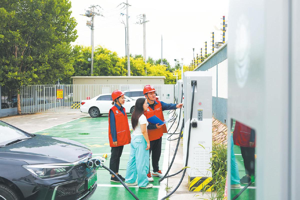 2025年7月3日,国家电网首都电力(亦庄)共产党员服务队队员在同宁超充站为客户提供新能源汽车充电服务。 张庆玉 摄