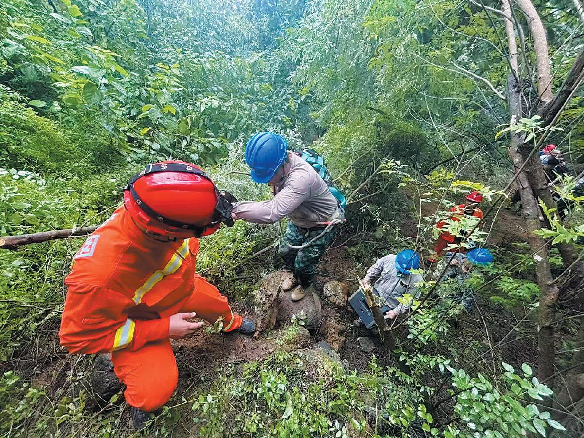 2025年7月27日,国网北京密云供电公司抢修人员携带应急发电设备,徒步进入冯家峪信号中断区域运送设备。林一轩 摄