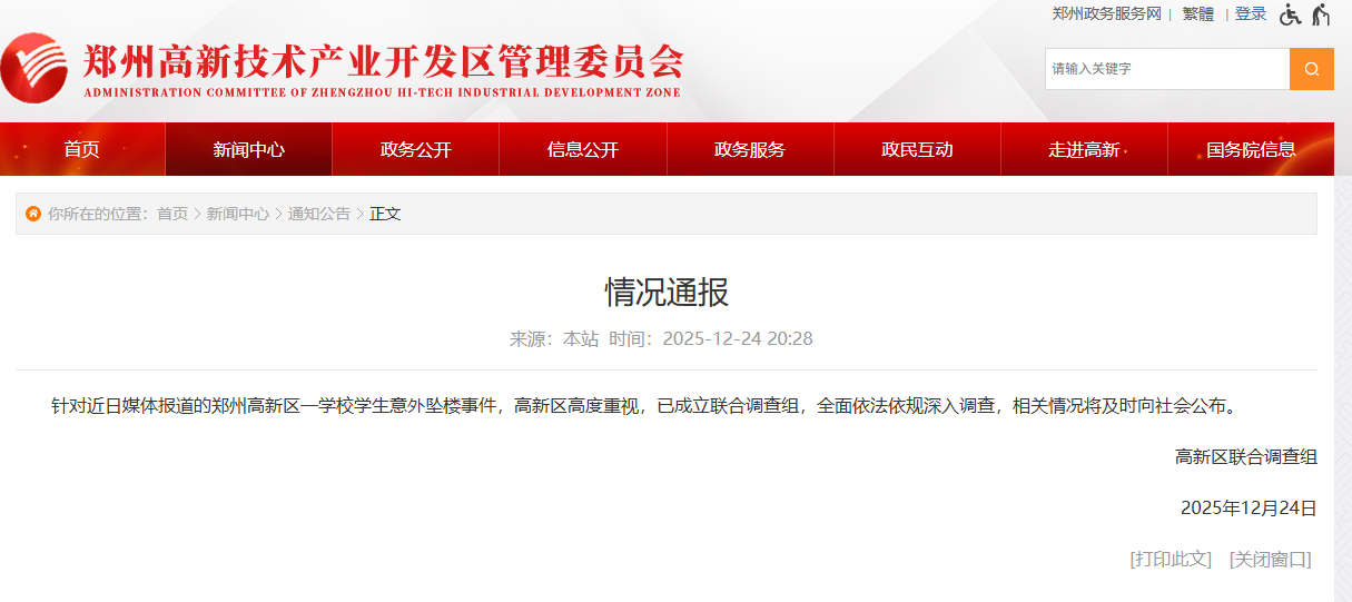 新京报讯 12月24日,高新区联合调查组发布情况通报:针对近日媒体报道的郑州高新区一学校学生意外坠楼事件,高新区高度重视,已成立联合调查组,全面依法依规深入调查,相关情况将及时向社会公布。