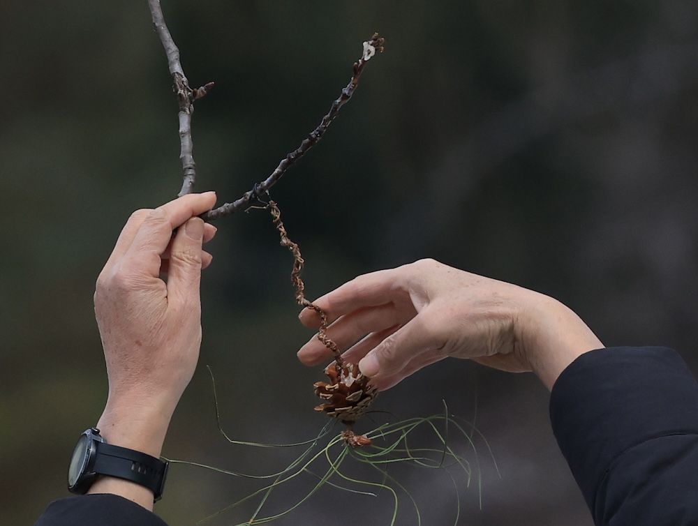 12月16日12时左右,玉渊潭公园樱花区玉树临风,一位拍摄者用铁丝将松球拴到枝头上。