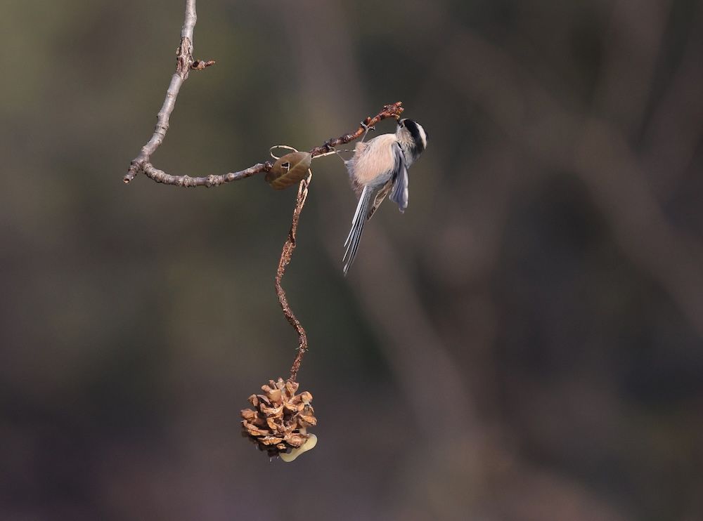 12月16日,玉渊潭公园樱花区玉树临风,北长尾山雀与诱拍者挂起的抹有蜂蜜的松球。