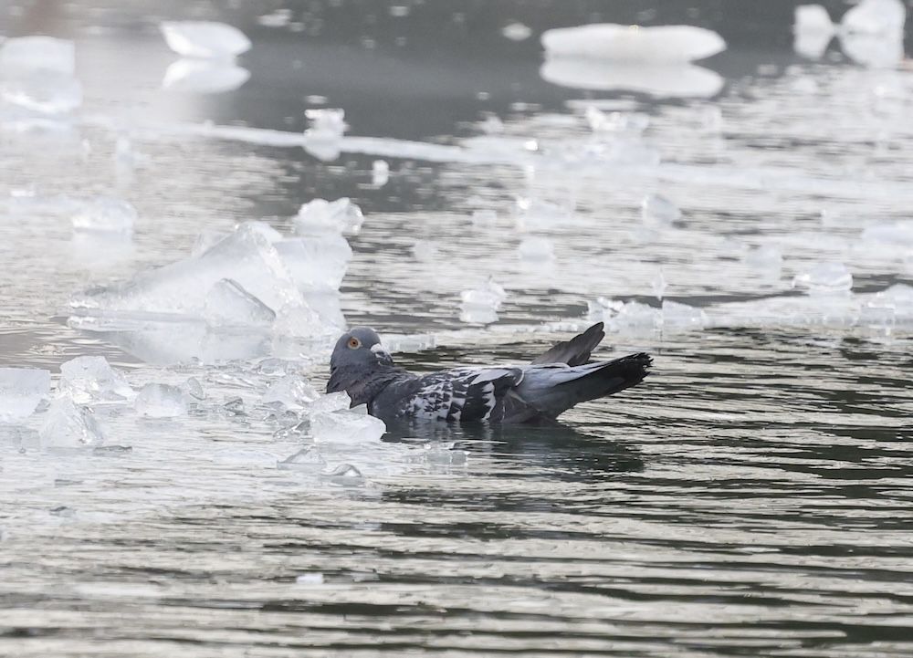 12月16日12时40分,玉渊潭公园中堤桥南侧,用于诱拍的鸽子被抛到冰面。这是一只被剪羽的鸽子,无法飞起。