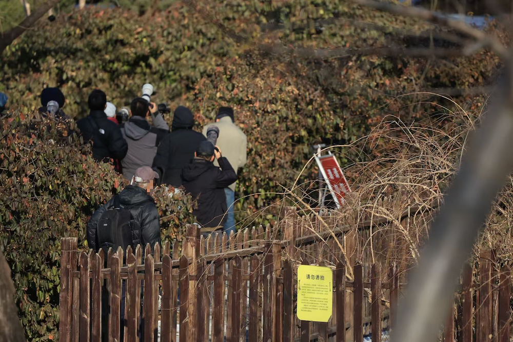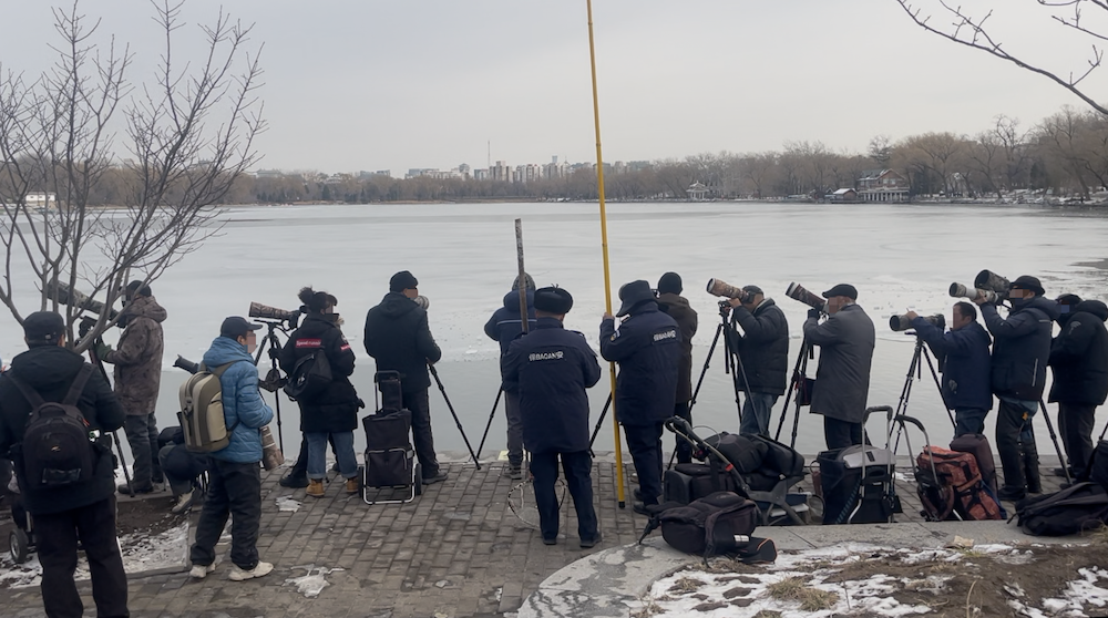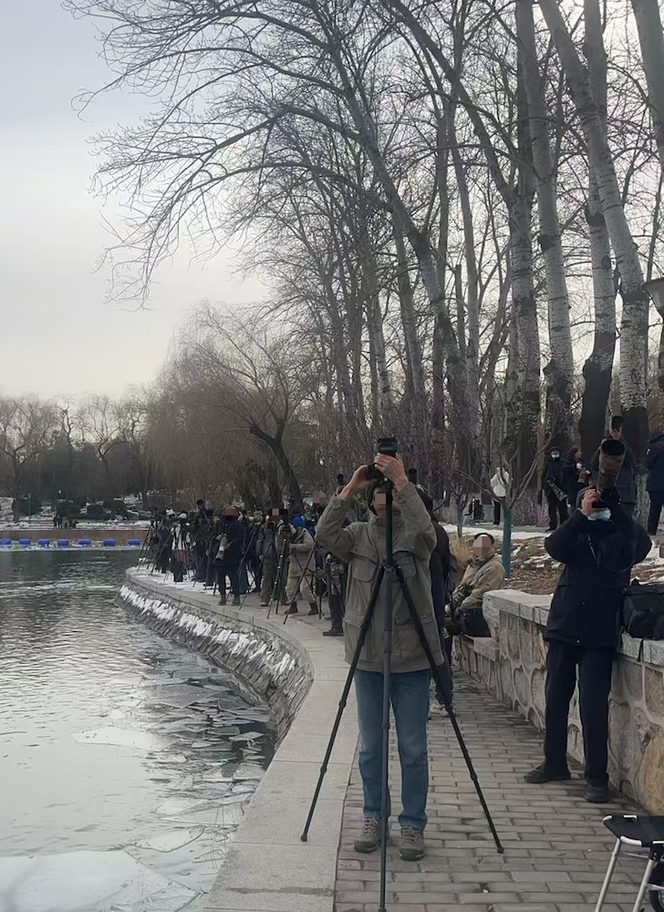 12月16日中午12点,在距离玉渊潭公园南门最近的湖边,已经聚集了不少人。随着时间的推移,岸边架起了越来越多的相机。