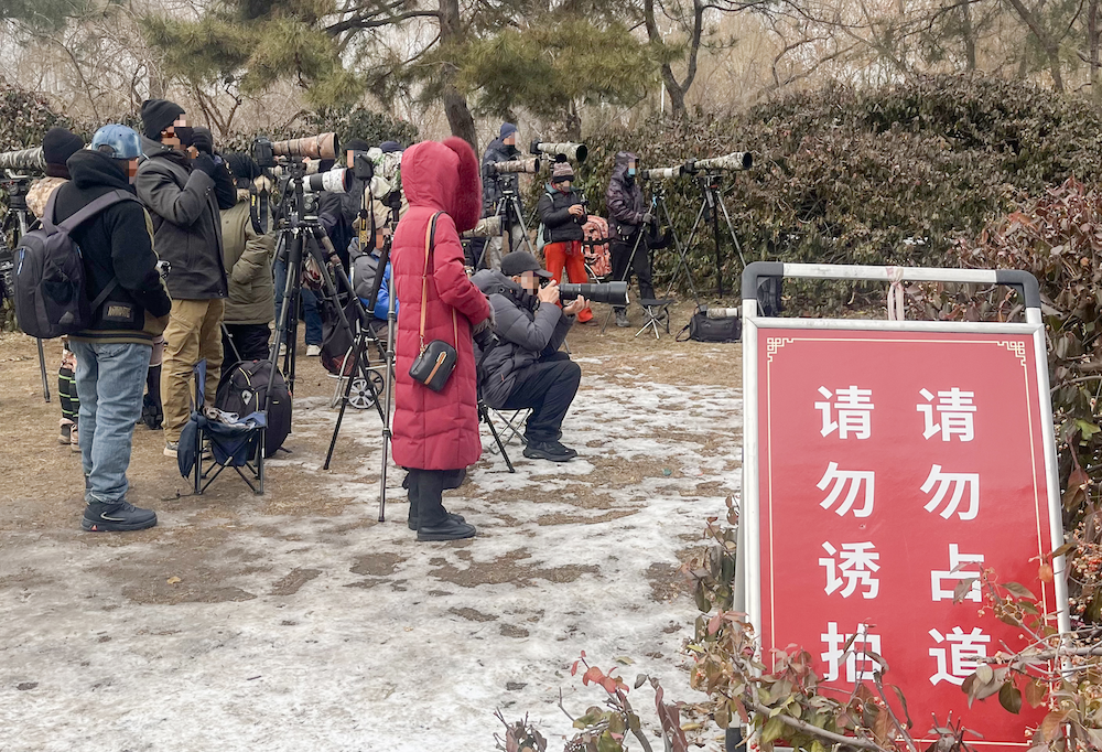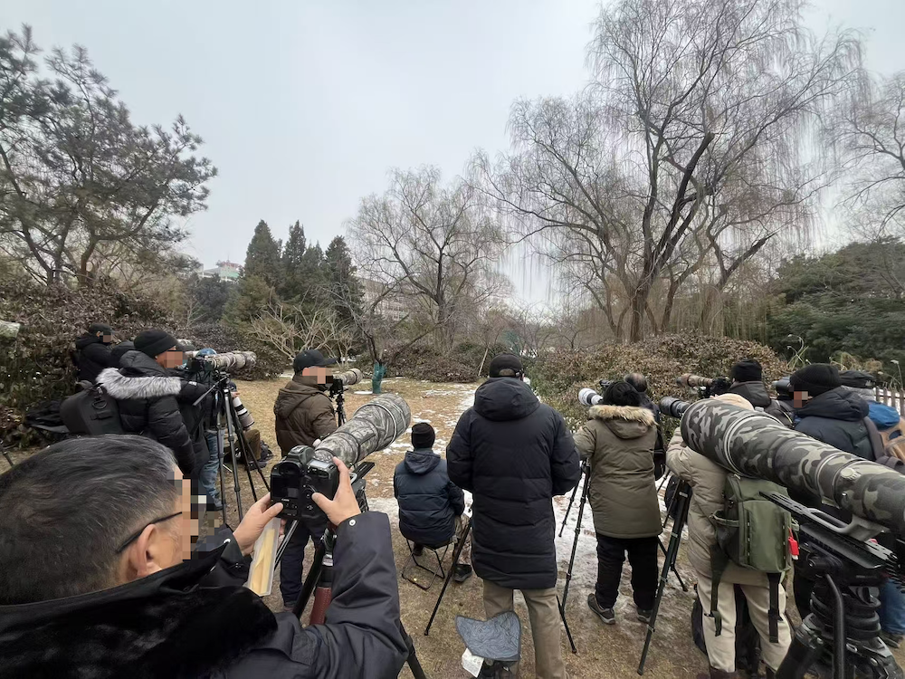 12月16日,玉渊潭公园樱花区玉树临风,拍鸟的人群。根据邓文洪介绍,拍摄时的闪光灯、快门声等也可能使鸟类产生应激反应。