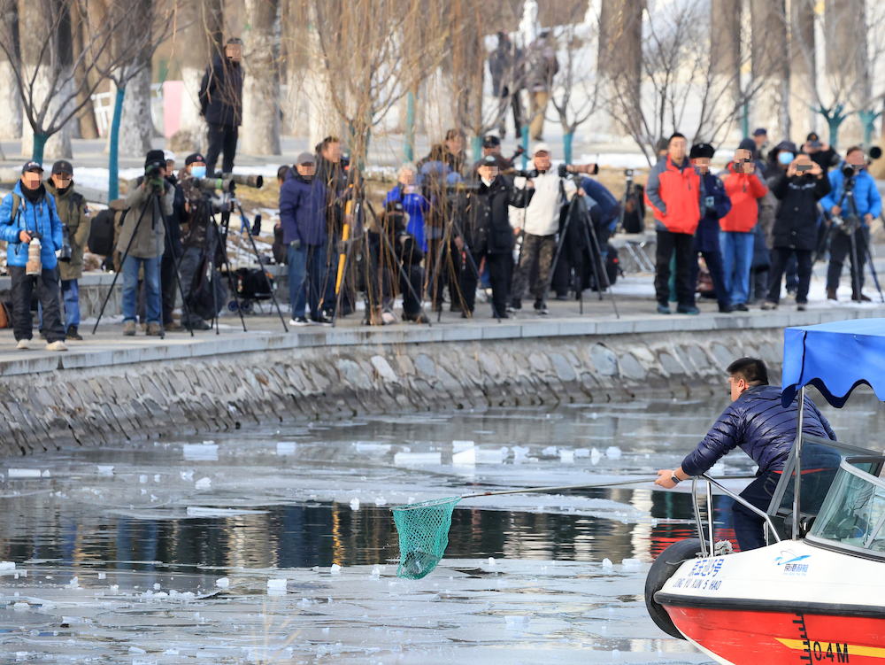 12月16日,玉渊潭公园中堤桥南侧的湖面上,有人放下鸽子作为拍鸟的诱饵。