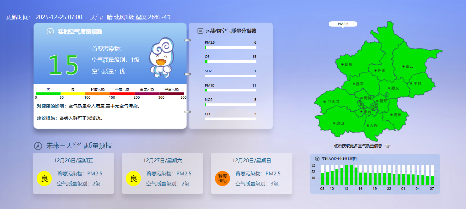 据北京市生态环境监测中心今早7时数据,目前实时空气质量指数15,空气质量优。