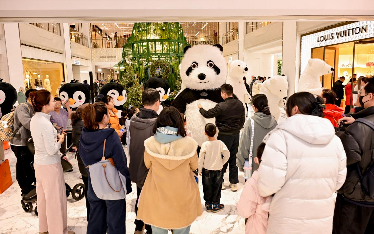 12月20日的“极光巡游”活动中,憨态可掬的大熊猫人偶与小朋友牵手互动。 图/北京SKP