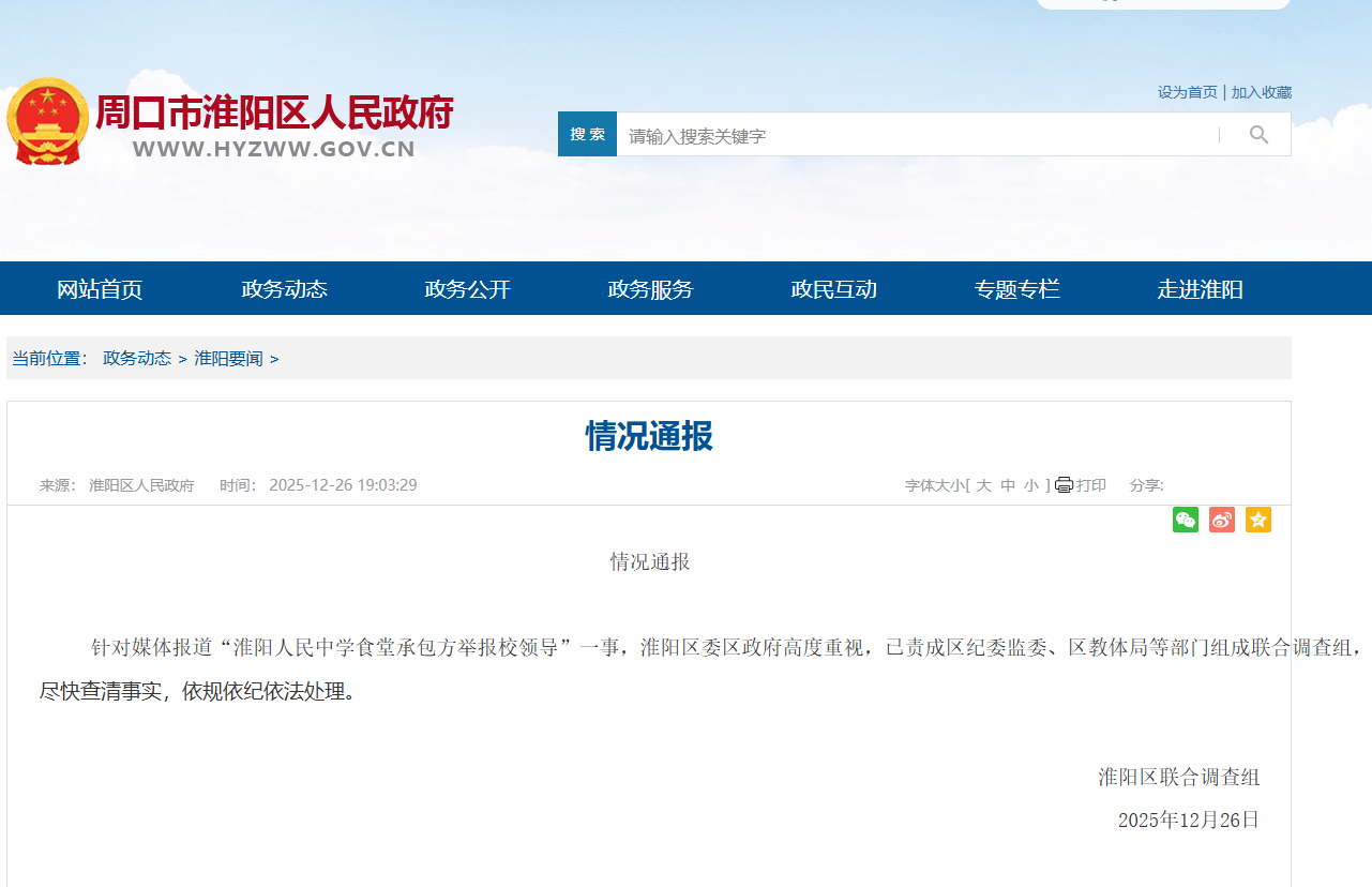 新京报讯 12月26日,河南周口淮阳区联合调查组发布情况通报:针对媒体报道“淮阳人民中学食堂承包方举报校领导”一事,淮阳区委区政府高度重视,已责成区纪委监委、区教体局等部门组成联合调查组,尽快查清事实,依规依纪依法处理。