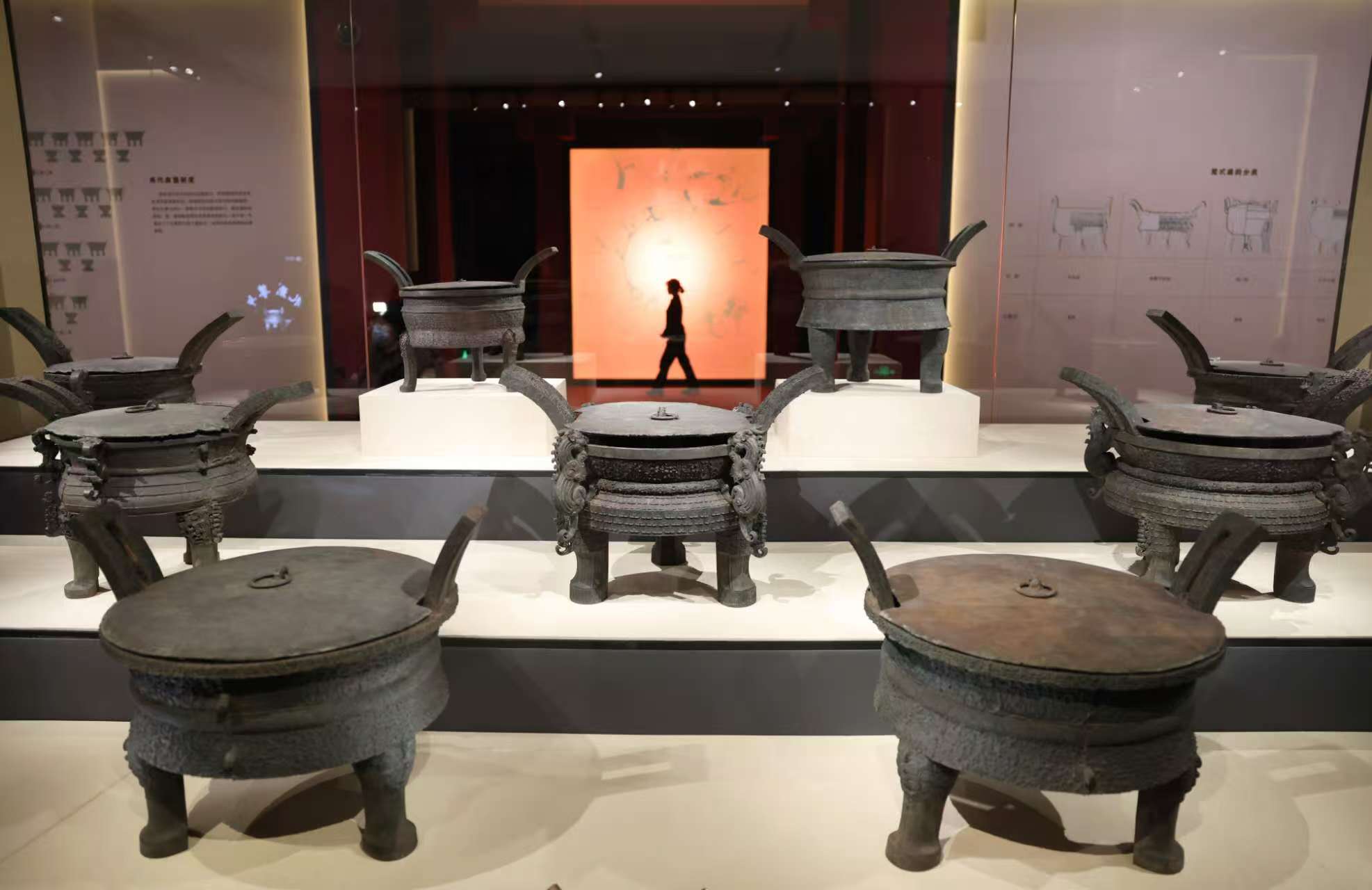 展出的一组青铜升鼎。升鼎是盛装牲肉以供祭祀的食器,是楚国王室和高级贵族的专用随葬品,也是最能代表楚文化特征的器物之一。新京报记者 浦峰 摄