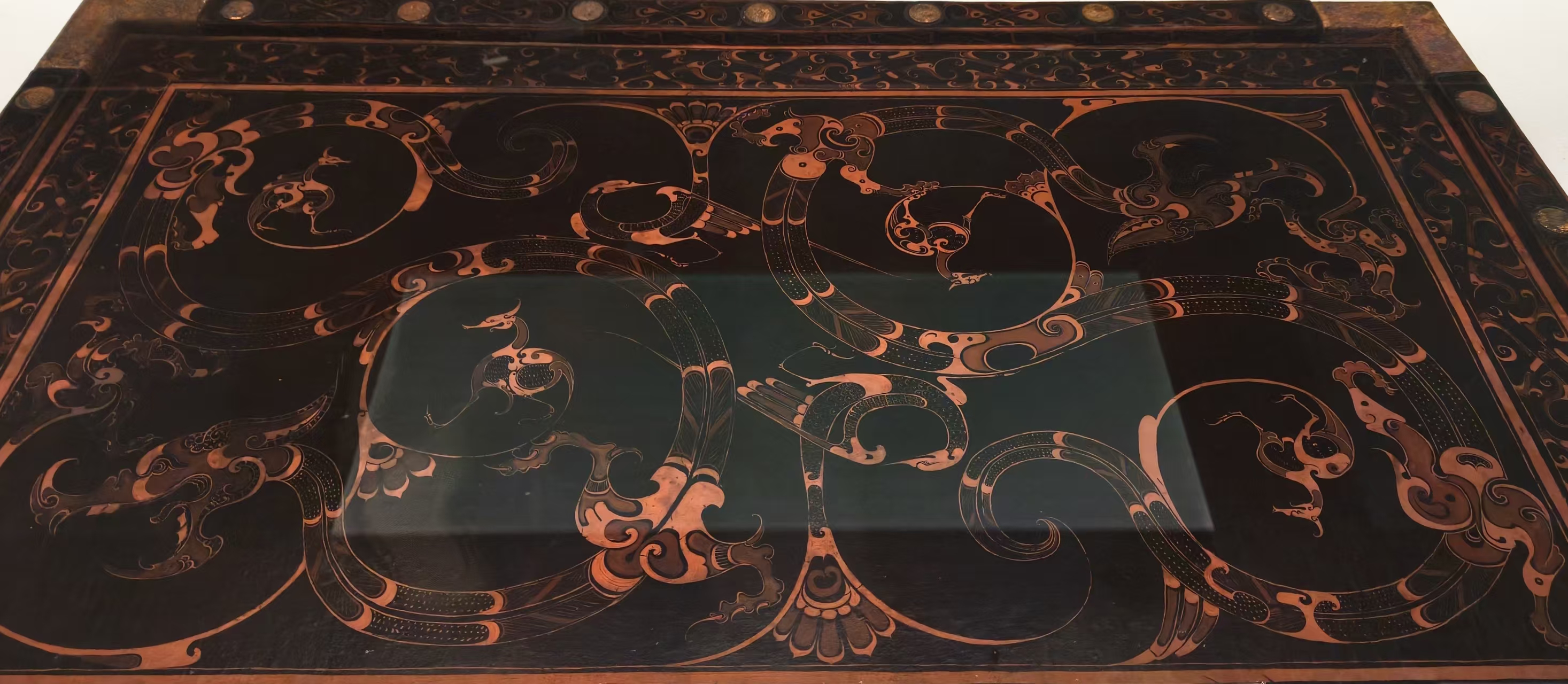 木案整体呈方形,四周设有矮足,边框及四角分别饰有鎏金铜泡钉和鎏金铜包角,漆面上绘有龙、凤、仙鹤和爬兽等精美纹样,纹饰飘逸流畅。在古代,木案用于宴饮时承物。先秦时期,贵族用餐多采用分食制,跪坐于席上,面前摆放一张独立的案,案上分列耳杯、盘等成套的餐具。