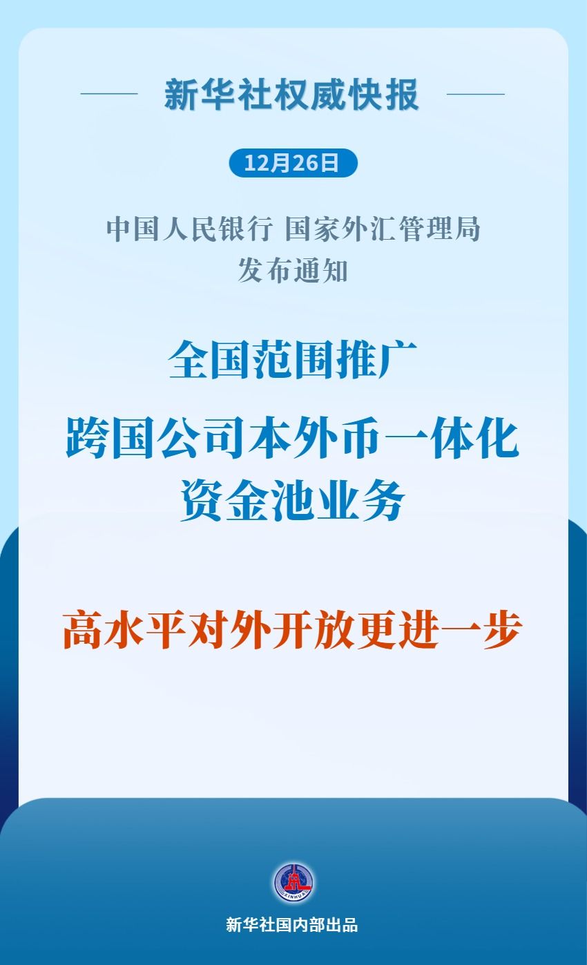 据新华社消息,中国人民银行、国家外汇管理局12月26日发布通知,在总结前期部分地区试点经验的基础上,决定在全国范围内推广跨国公司本外币一体化资金池业务,进一步便利跨国公司集团资金归集、提高资金使用效率。该通知自发布之日起实施。