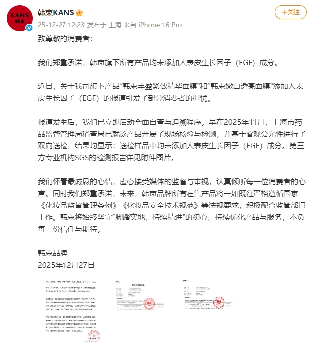 新京报讯 12月27日,@韩束KANS发文称:我们郑重承诺,韩束旗下所有产品均未添加人表皮生长因子(EGF)成分。