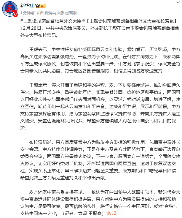 王毅表示,中柬铁杆友谊经受国际风云变幻考验,坚如磐石、历久弥坚。中方高度关注柬泰边境紧张局势,一直致力于劝和促谈。在各方共同努力下,柬泰两国军方达成停火协议,朝着恢复和平迈出重要一步,中方对此表示祝贺。停火完全符合柬泰人民共同愿望,符合地区各国普遍期待,相信会得到各方欢迎支持。