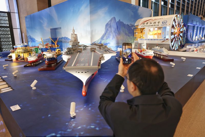 嘉宾拍摄“福建舰”航母模型。展览搭建“原材料—关键零部件—整机装备—产业生态”全链条展品体系,针对大型船舶、大型飞机、高铁动车等“国之重器”,采用高精度比例模型精准还原,从结构肌理到外观细节均复刻原机风貌,既满足专业观众的技术探究需求,也适配普通观众的科普体验,让“大国重器”的魅力触手可及。