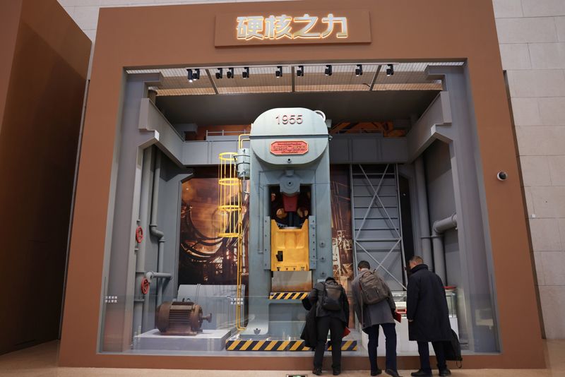 展览还原几十年前的生产和生活场景,与当前生产、生活形成对照的同时,唤起观众的情感共鸣。图为嘉宾参观中国第一台压力机(1:1模型)。