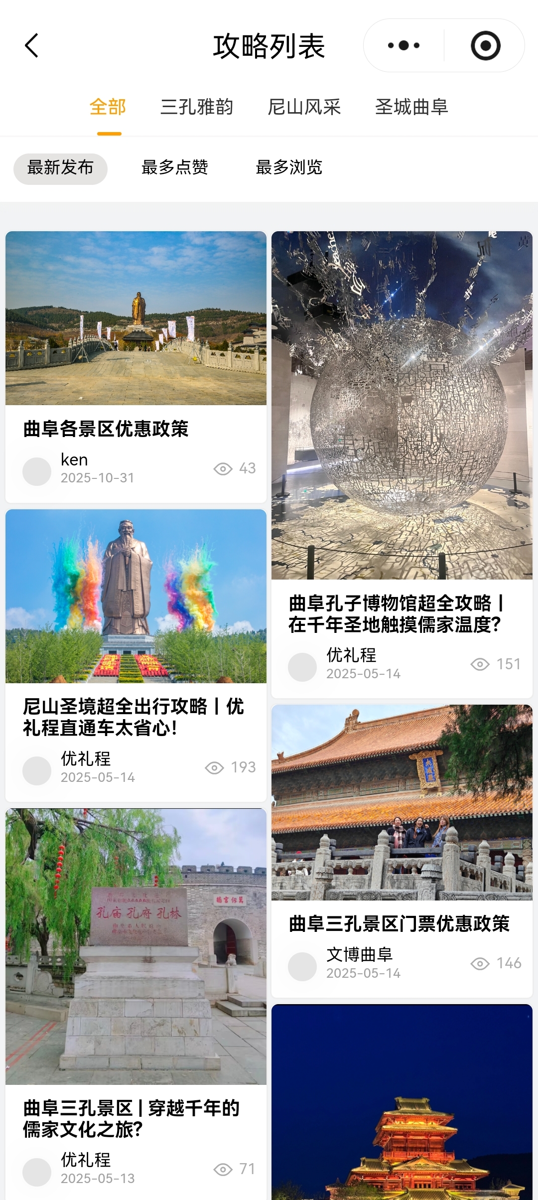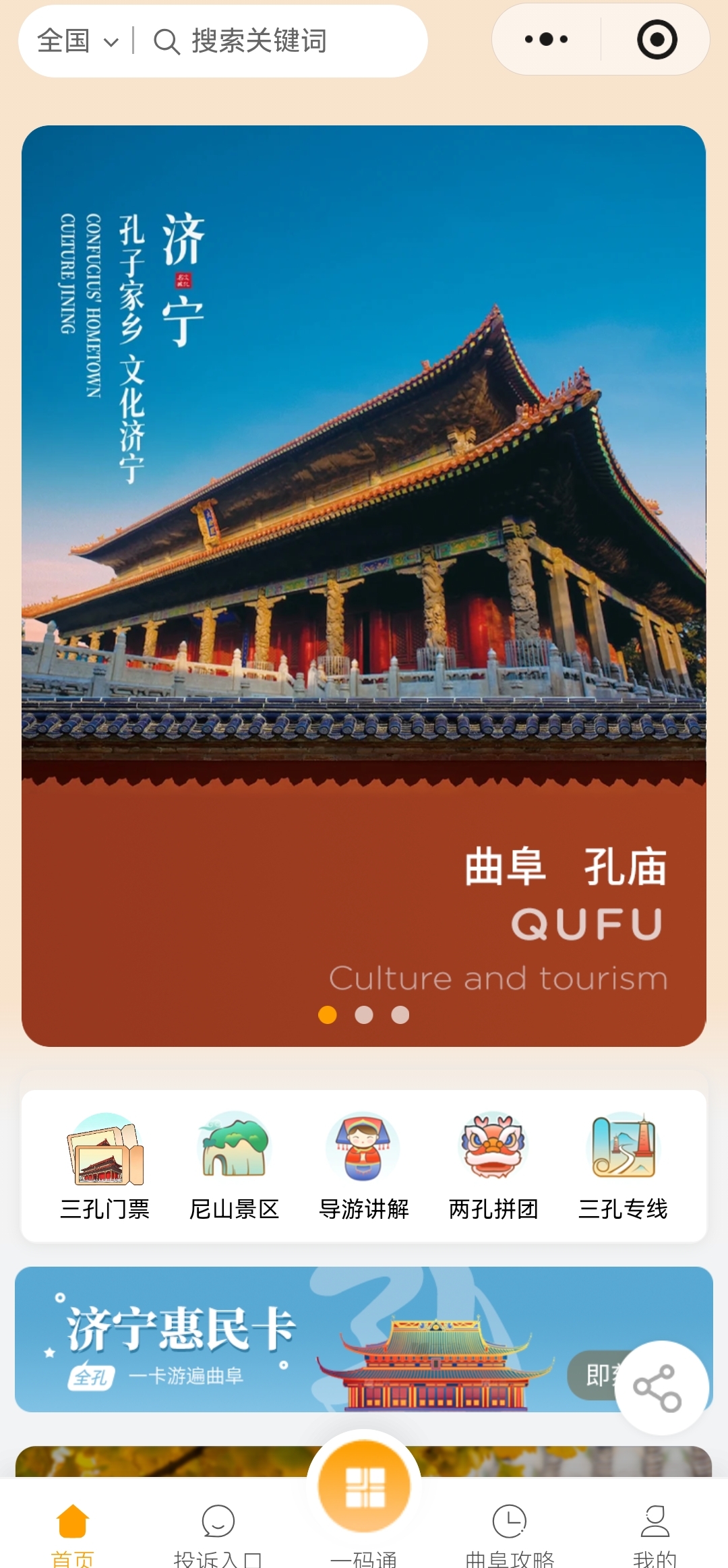 通过微信搜索“优礼程”小程序后,打开界面就可以看到包括三孔景区、尼山景区、鲁源村跨年夜门票,以及曲阜各景区优惠政策和旅游攻略等一应俱全。同时依托曲阜孔子旅游(集团)导游有限公司400余名导游的优质资源,游客可提前预定金牌、资深、外文、网红等各种导学讲解。对于单个游客来说,可以进行孔庙、孔府、孔子博物馆等各种精品拼团。在出行方面,依托曲阜有容旅游汽车有限公司,可以在“优礼程”一码好旅游智慧平台下单三孔景区专线车,包括全线、往返和单程票,均可提前购买,去曲阜高铁东站、曲阜游客中心和酒店、三孔景区之间,实现自由换乘。